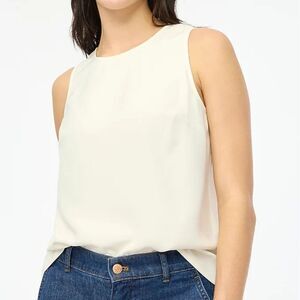 This cream blouse from J. Crew features a boxy, sleeveless design with a high, rounded neckline. Made from a knit polyester fabric, it offers a simple yet versatile style perfect for pairing with various outfits.