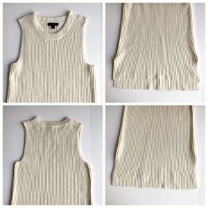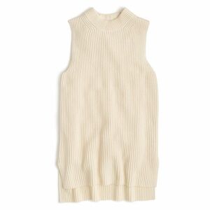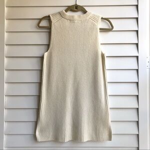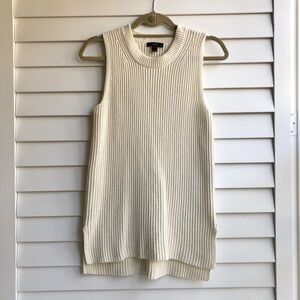 J. Crew Sleeveless Tunic Sweater in ivory. Sleeveless tunic top with longer length and side slits which make it perfect for wearing on its own, over button-ups or underneath blazers. Cotton/nylon/merino wool. Rib trim at neck. Worn but in excellent condition with no visible signs of wear. Approx. 26” long front, 28” long back and 16” across from armpit to armpit.