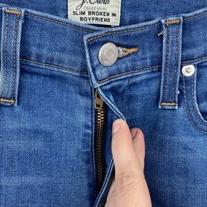 J. Crew Slim Broken in Boyfriend Jeans Womens 24 Blue White Floral Skinny Denim. Slim Leg. Floral. Embroidered Daisies Detail. Zip with button Closure. Belt Loops. Cute Summer. 91% Cotton, 6% Polyester, 3% Elastane