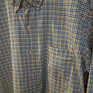 J. Crew Slim Fit men's extra large long sleeve button down plaid shirt. 100% cotton. Single chest pocket. Button down collar. White, blue and yellow plaid. Shirt is in excellent used condition. Please see photos for details and measurements. This is a slim fit shirt.