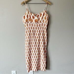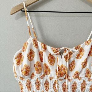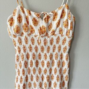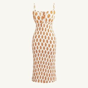 Brand new with tags J. Crew Smocked Linen Dress in Gathered Floral Block Print. White with rusty orange/gold. Size 10. 100% linen. Midi length. Adjustable spaghetti straps. Zip closure at back with hook. NWT- writing on interior care tag. Beach, travel, vacation.