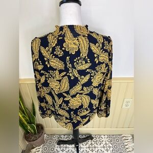 J Crew Smocked Ruched Chiffon Regal Gold Navy Floral Coquette Blouse Women Sz XS