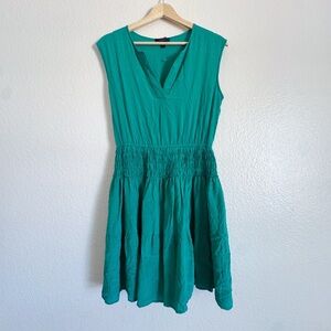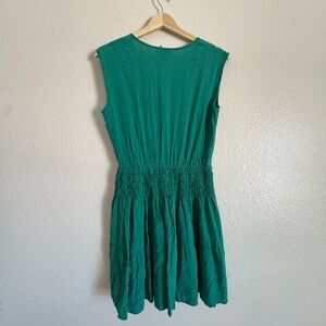 Chic sleeveless dress in a vibrant green color. Features a stylish gathered waist and a flowy skirt.