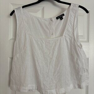 This breezy top is crafted from lightweight 100 percent linen and comes in a cool, relaxed fit with a face-framing squareneck and button details down the back.