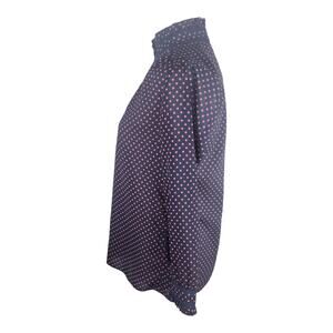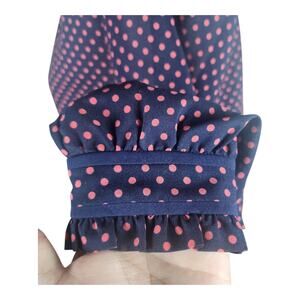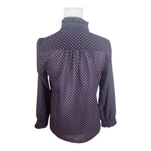 Add a touch of playful elegance to your wardrobe with this charming J. Crew blouse. Featuring a delightful polka dot pattern and a stand-up ruffle collar, this blue blouse is perfect for both casual and dressy occasions. In excellent condition, this women's size 2 blouse offers a flattering fit and comfortable wear. The ruffle collar adds a sophisticated touch, making it a versatile piece to pair with skirts, jeans, or trousers. The polka dot pattern brings a fun, yet classic vibe to your outfit. Don't miss out on this stylish and unique blouse from J. Crew!