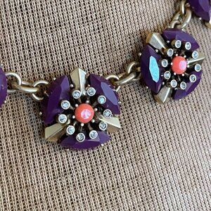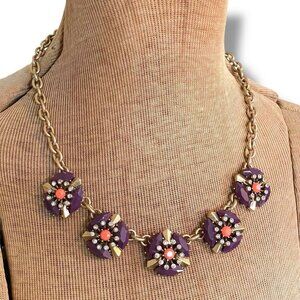 J Crew Statement Necklace Purple Coral Gold Rhinestone Crystal Cluster Retro 18"