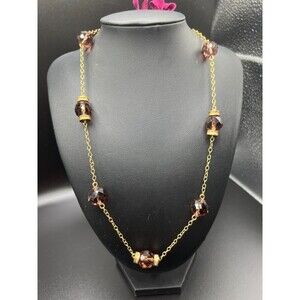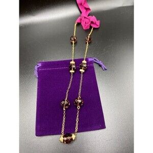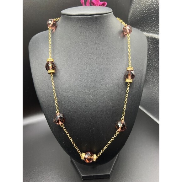 J. Crew station necklace with purple faceted beads and crystal disks. Tied with a magenta ribbon.