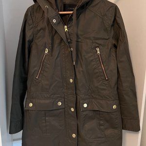 Womens J.Crew Hooded Distressed Green Military Long Field Zip up Jacket Size Petite Medium.
