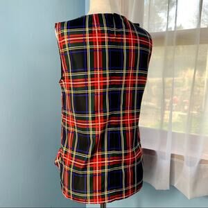 Perfect for the holidays! Diagonal ruffle across the front and a classic Stewart plaid. Pair with pants, skirt or jeans, wear it alone or under a sweater or blazer! In excellent used condition