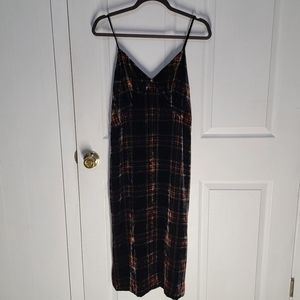 Pre-owned and in great condition. Women's J. Crew plaid velvet dress. Adjustable Spaghetti straps. Zipper closure in the back. Side slits. Fitted dress with no stretch. Has attached lining.