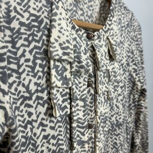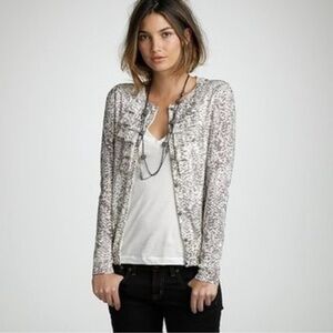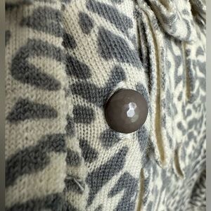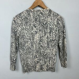 Beautiful little cardigan from J. Crew featuring a gray pattern on a cream background. Front is embellished with an interesting detail - is it ruffles? Loops? Flaps? Not sure what to call them but they are constructed of the same material. 3/4 leng sleeves.