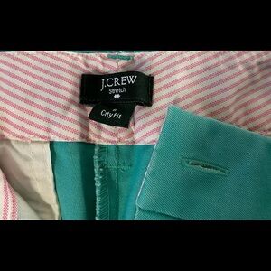 Elevate your casual summer wardrobe with these J. Crew mint green sea foam blue cotton chino shorts in size 6 and 33" waist. The City Fit design is tailored to flatter and the stretch material ensures a comfortable fit. The solid pattern and twill fabric add a touch of sophistication to the casual flat front style. These shorts are perfect for a day of travel or a casual outing. Machine washable for easy care and maintenance.