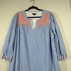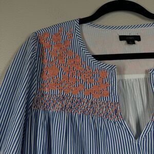J. Crew Striped Embroidered Popover Shift Dress Ruffle Hem, Smocked Cuffs, Preppy, Coastal, In Excellent Preowned Condition. Women’s Size Large