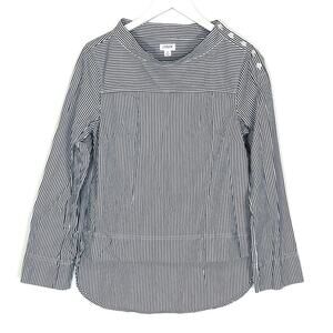 Standing funnel neck with shoulder buttons and a dramatic shirttail hem. Black and white striped cotton poplin. Long sleeves. High low hem.