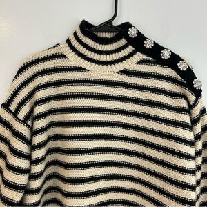 J. Crew Striped Mock Neck Black/Ivory Rhinestone Wool Blend Sweater Size Large
