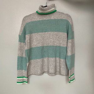 J.Crew striped turtleneck sweater in Supersoft yarn in "Heather Silver Mint". A mixture of merino wool, alpaca and stretch. This turtleneck features an exaggerated ribbed hem, drop sleeves and an extra layer of coziness at the neck. Preppy with a twist!