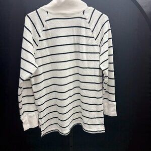 Women's J. Crew black and white striped wide button collar tunic in cloudspun fleece. Great condition. Size S. Pit to pit: 20.25". Total length: 25". Sleeve length: 18.75".
