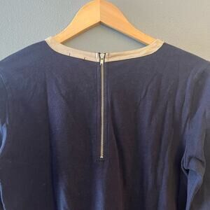 J. Crew navy blue sweater knit long sleeve t-shirt with silver leather trim around neckline. Exposed zipper on back. Size S