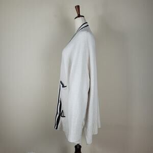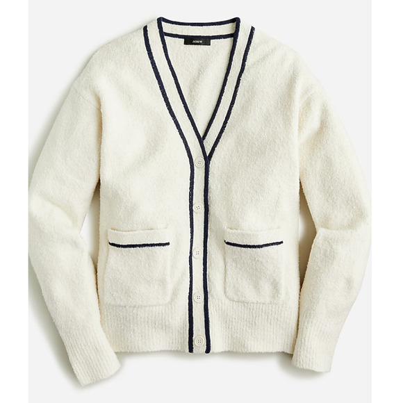 This oversized cardigan has a couple special touches, like navy trim down the front and on the pockets and cool, gold-rimmed buttons. Plus, it's designed with a longer length, which makes it a perfect early-spring layer.