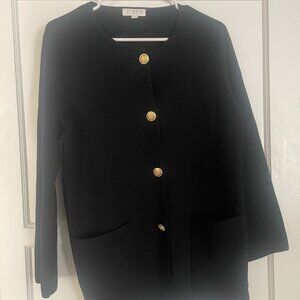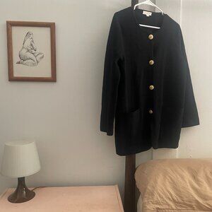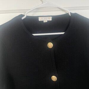 J.Crew Giselle sweater-blazer in a luxe merino-blend knit, classic black color, with front pockets and gold crest buttons. Size small. Materials: 35% Cotton / 35% Polyester / 30% Merino Wool. Worn only once.