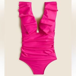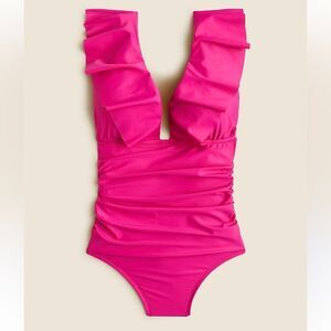 J Crew Women's Feminine Romantic Ruched Ruffle One Piece Swimsuit in Radiant Fuchsia Size 22. A subtly dramatic style with a sweet update. This swimsuit has a deep V-neck lined with ruffles and flattering ruching along the sides.