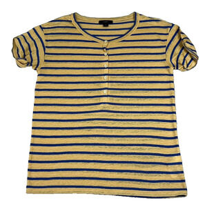 J Crew T-Shirt Women's Small Yellow Blue Striped Linen Rolled-cuff Henley Sleeve