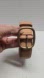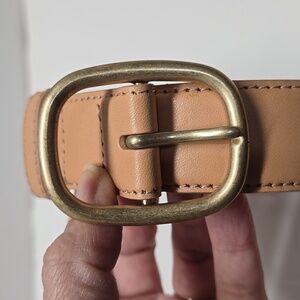 Elegant tan leather belt with gold accents. Ideal for versatile styling.