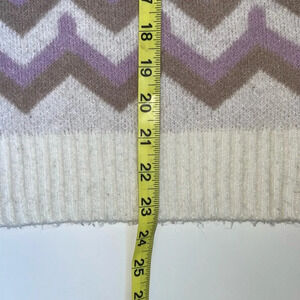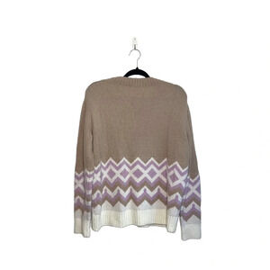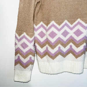J. Crew tan fair isle knit sweater. In excellent condition! Crew neckline. Long sleeves. Ribbed along the collar & bottom hem. Thick knit material. Tan with white & light purple fair isle print along the bottom. Size tag is missing, fits like a large.