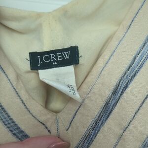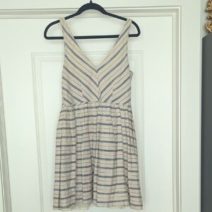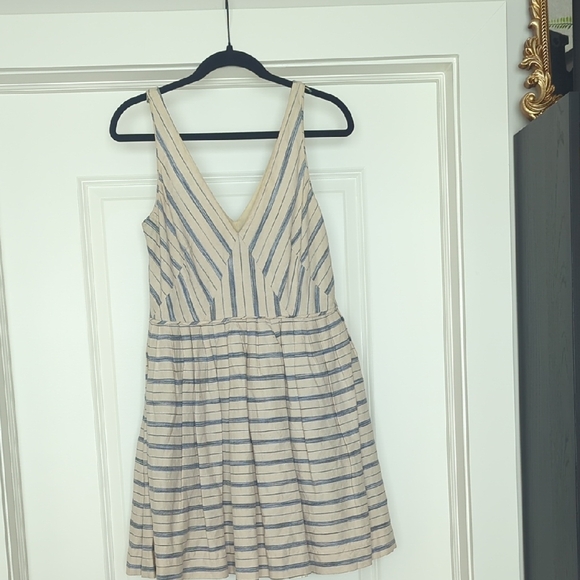 This sleeveless sundress by J. Crew features a plunging V-neckline and a mini length. The dress is designed in tan and cream colors with horizontal darker stripes. Small stain by side zipper. Dress is lined. Offer welcome