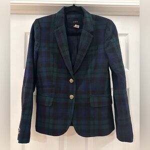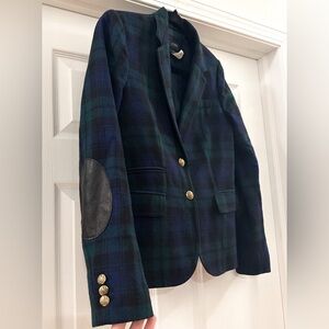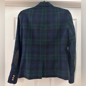 J. Crew Tartan Plaid Leather Elbow Patch Wool Blazer in Blue Green plaid. Size 4. Excellent condition. Lined. Brass button details at front and cuffs. Black leather elbow patches.