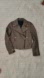 Chic taupe leather jacket. Features gold zippers and buttons. Ideal for a modern style.
