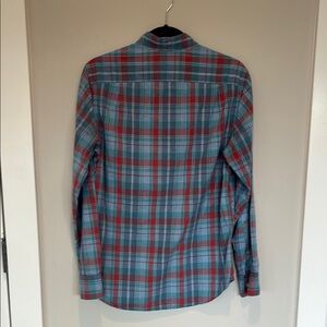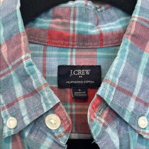 This J. Crew shirt showcases a classic plaid design in teal with red accents, crafted from comfortable cotton for everyday wear. Its long sleeves and button-down style make it a versatile addition to any casual wardrobe.