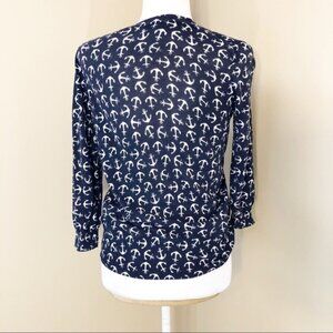 J. Crew The Clare Cardigan Small Navy with white anchors V neckline 3/4 length sleeves Button closure 100% cotton Maxine wash Armpit to armpit 17” Length 22 1/2” Sleeve length 18” Measurements are approximate with the garment laying flat. Please use as a guideline not to guarantee fit. Pre-owned. No rips, holes or stains. Smoke free home J Crew style and quality Clare cardigan anchor print nautical boating lightweight cardigan T5