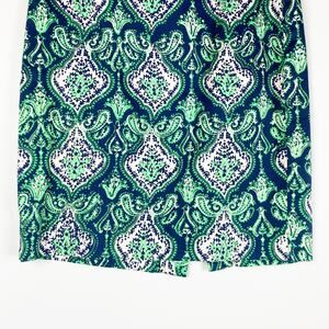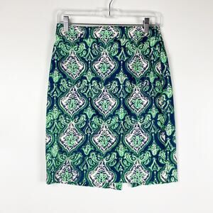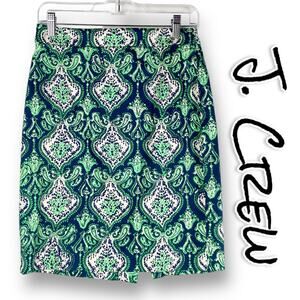 J Crew The Pencil Skirt womens skirt in green and blue. Moroccan print skirt in green and blue pattern. Knee length pencil style skirt with back zip and back slit. Size 2. Excellent used condition. No flaws detected. See measurements for proper fit.