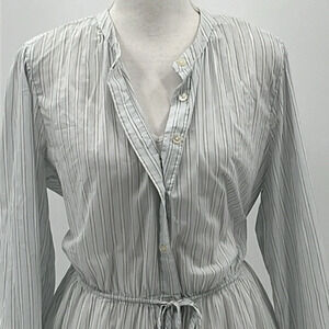 J. Crew Tie Waist Cotton Voile Midi Dress in Sheer Blue Deck Stripe - Size 12. Great pre-owned condition. There are two small spots on the back, shown in pic. Our favorite way to get dressed in 30 seconds or less: this easy, slightly sheer shirtdress (with a clean collar) that feels as comfy as it looks polished. We also love it over a swimsuit as a superchic cover-up. Plus, it's made with organic cotton that is grown without chemical fertilizers and pesticides from nongenetically modified seeds. A-line silhouette. Falls below knee. Cotton. Button closure. Slip lining. Machine wash.