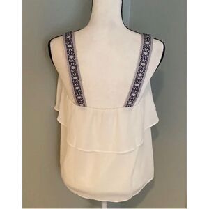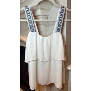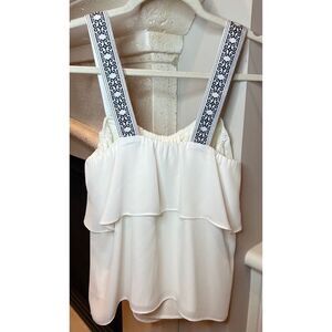 J. Crew Tiered Tank Top White Blue Women’s Blouse Size 2 Style #J0871, Wide embroidered tank straps (1.5 in), navy blue and white pattern, Tiered flowy material in white color, Comfortable stretchy elastic around top/under arms.