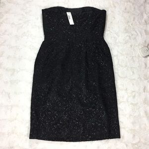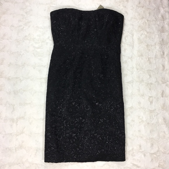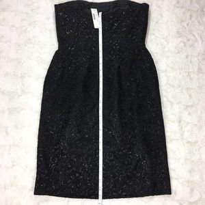 Inky black lace with metallic threads. Strapless with boning at sides for support. Back zip. Straight skirt with on seam pockets. Falls above knees.