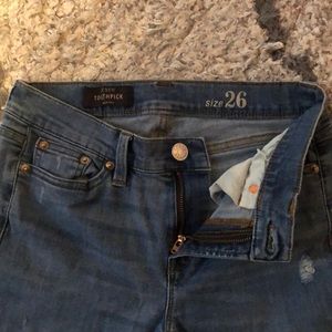 J. Crew jeans in their Toothpick fit which is similar to a skinny fit. The front has a cute patch on the right pant leg and a rip on the left knee. Great condition no intentional rips or stains. Smoke free home. Inseam 26.5”