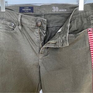 Cute and distinctive J. Crew olive green “Toothpick” jeans with red and white ribbon stripes along the side seams. Classic five pocket style. Excellent pre-owned condition. Size 30.