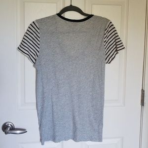 Cute and casual J. Crew shirt, size L. Navy neckline with navy and white stripes on the shoulders. In excellent condition.