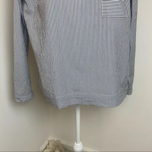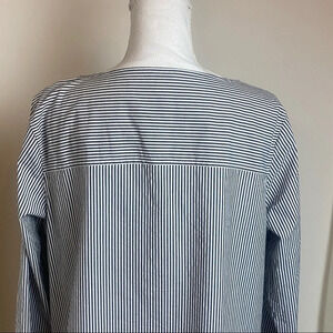 Black and white striped long sleeve wide neckline box fit blouse with pocket. Size Large