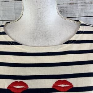 J. Crew Top Pullover sz Small Ivory Navy Blue Striped Lip Stick Lips Embroidery