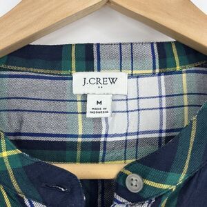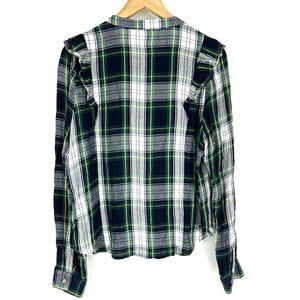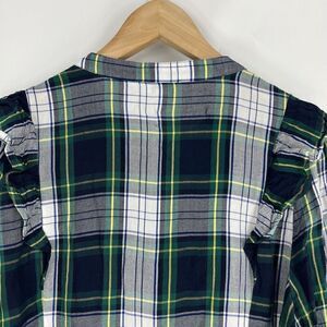 J Crew Top Size Medium Womens Green Navy Ruffle Button Front Long Sleeve Plaid