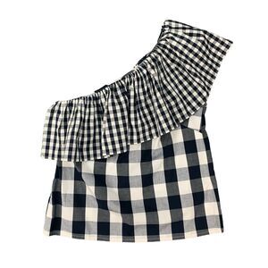 J CREW TOP WOMENS 2 NAVY GINGHAM PLAID COTTON STRETCH POPLIN RUFFLE ONE SHOULDER