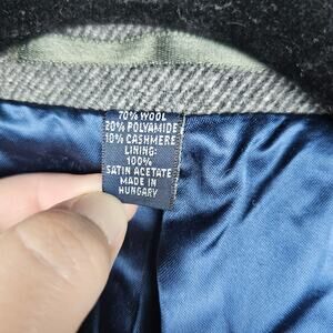 Beautiful cashmere and wool blend overcoat. Fully lined with a blue satin material. In a gray almost striped color pattern. In good pre owned condition, has some lining discoloration as shown in the photos.