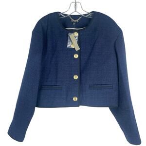 J. Crew Tweed Bomber Lady Jacket Wool Blend Navy Gold Button Size 14