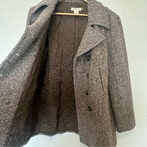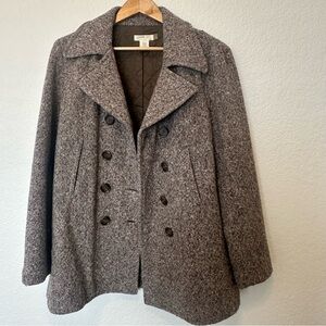 This versatile, classic brown J Crew wool blend tweed peacoat would be a good addition to any winter wardrobe. In good, gently owned condition with two front pockets, double-breasted and nice button details.