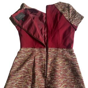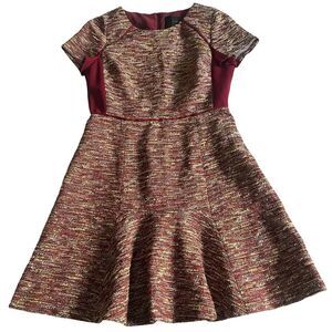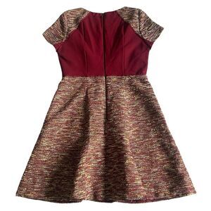 Features mixed metallic tweed design with deep wine colored insets. Zipper back closure, lined, & the has a flattering fit & flare design. Gently preloved. Size 6. Approximately PTP: 16”-18.5” L: 34” I welcome offers! I will accept or counter. Please note, if you are prompted with a minimum amount when trying to send an offer, disregard that & message me your offer instead. I will gladly consider it!