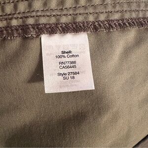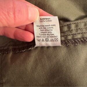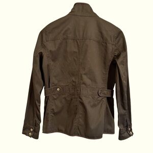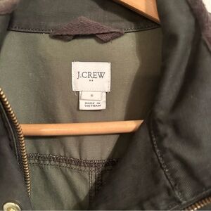 This casual, 100% cotton, J. Crew utility jacket features a hidden zipper with snap closures, chest, flap-patch, and hip pockets, and a standing collar. It is in EUC without stains, rips or holes. It is machine washable with like colors.