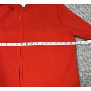 J Crew Factory Vanessa sweater jacket in very good pre-owned condition. The sweater is a bright reddish coral. Open front with pockets. Please see pictures for measurements and condition.